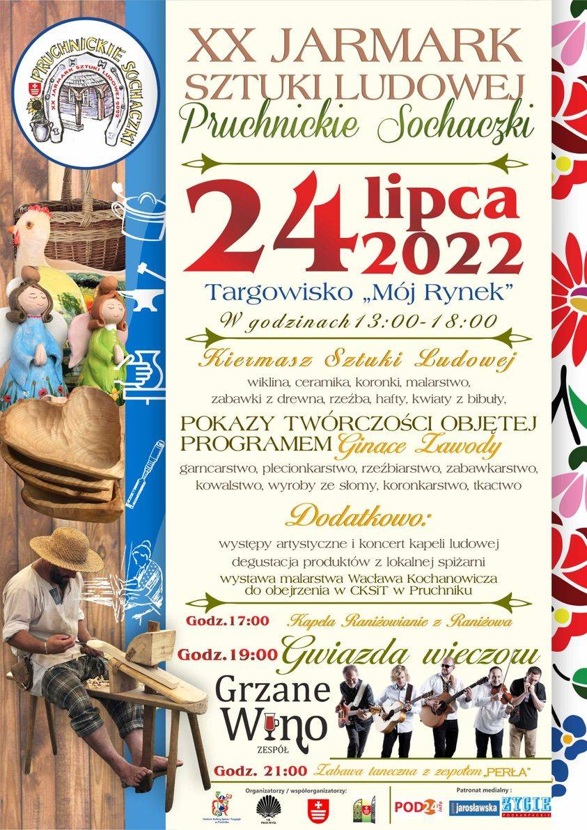 Zapraszamy na „Pruchnickie Sochaczki” XX Jarmark Sztuki Ludowej. 24 lipca na pruchnickim targowisku "Mój Rynek" w godzinach od 13.00 do 18.00 ponownie będzie czekał na Państwa bogaty kiermasz rękodzielniczych wyrobów i pokazy rzemiosła tradycyjnego. Na gości czeka jeszcze mnóstwo dodatkowych atrakcji, przewidziano występy artystyczne, m. in zagra Kapela "Raniżowianie" z Raniżowa, a gwiazdą wieczoru będzie zespół "Grzane Wino", który rozgrzeje publiczność dużą dawką folku, piosenki turystycznej i poetyckiej. Szczegóły na plakacie.