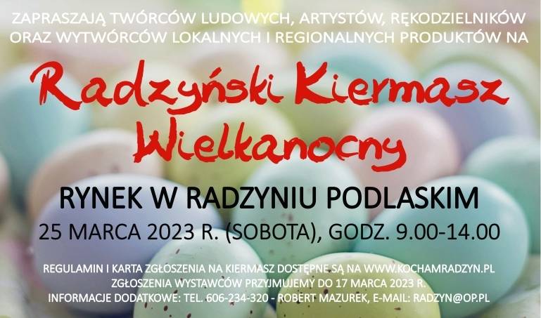 Miasto Radzyń Podlaski oraz Radzyński Ośrodek Kultury zapraszają na Radzyński Kiermasz Wielkanocny. Wydarzenie odbędzie się w sobotę 25 marca na Rynku w Radzyniu Podlaskim. Początek o godz. 9.00.