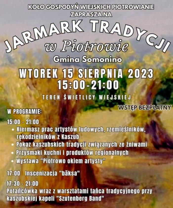 Jarmark Tradycji odbędzie się we wtorek, 15 sierpnia w godz. 15.00 - 21.00 na terenie Świetlicy Wiejskiej w Piotrowie.